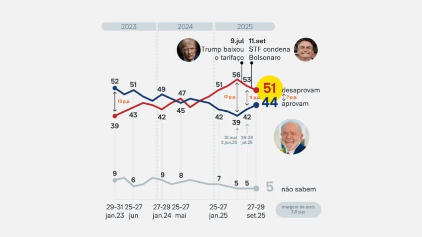 A aprovação do governo Luiz Inácio Lula da Silva (PT) subiu para 44%, segundo pesquisa do PoderData realizada de 27 a 29 de setembro de 2025. A rejeição está em 51%, mas a diferença entre os dois índices caiu para 7 pontos percentuais.