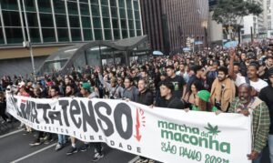 Manifestantes defendem fim da criminalização, políticas antirracistas e acesso medicinal durante ato na Avenida Paulista.