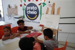 As crianças que participam do projeto social das aulas de inglês na unidade do Prato Cheio, do bairro da