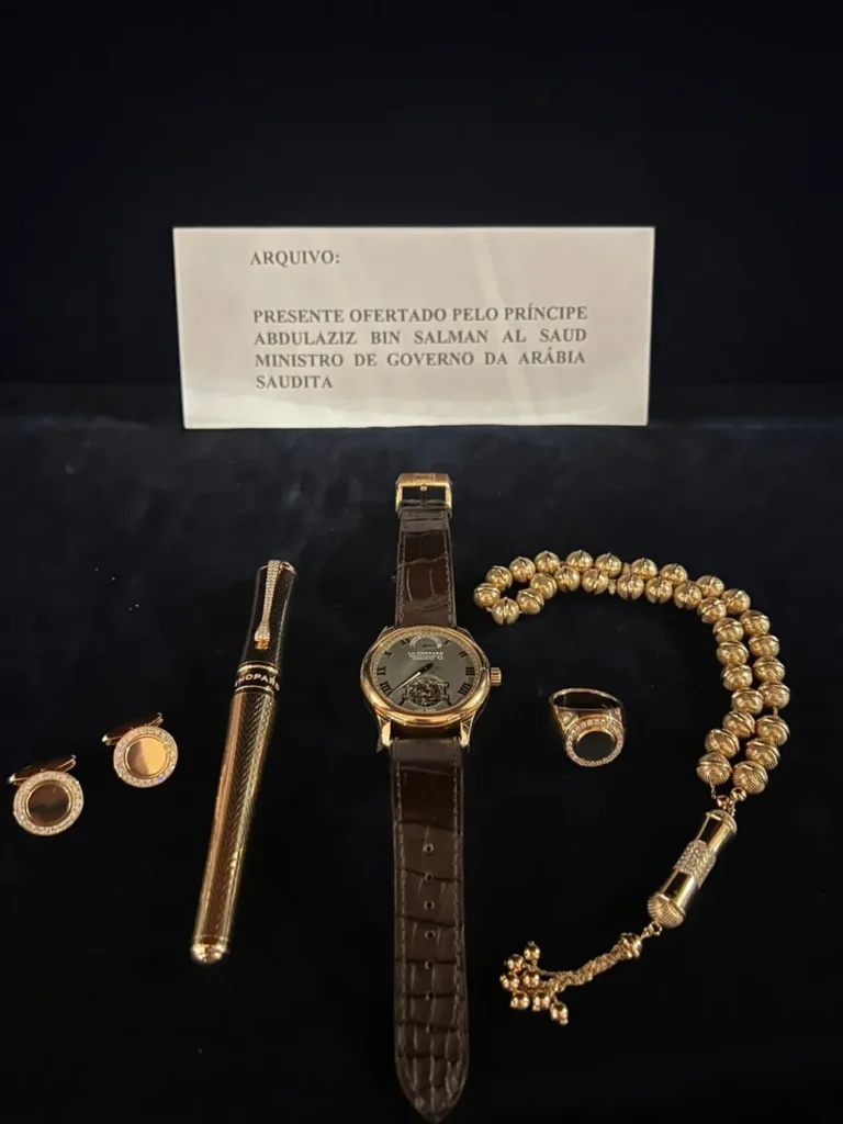 Os itens, da marca suíça de diamantes Chopard e avaliados em R$ 500 mil, incluem relógio, caneta, anel, abotoaduras e masbaha (um tipo de rosário).