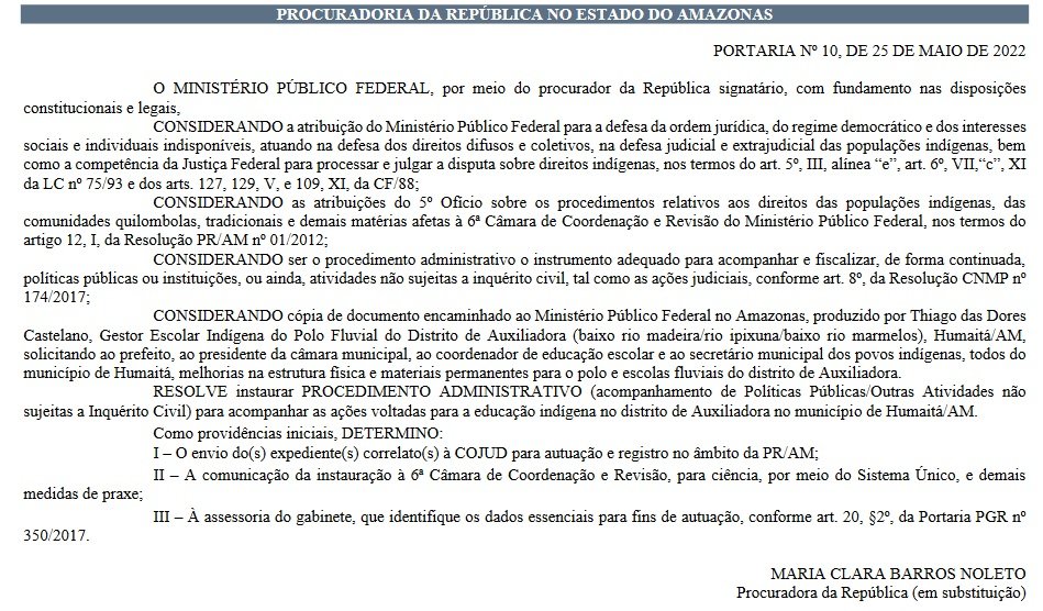 A Procuradora da República Maria Clara Barros Noleto determinou que o Ministério Público Federal no Estado do Amazonas (MPF-AM) instaure um procedimento administrativo para acompanhar as ações voltadas para a educação indígena no distrito de Auxiliadora, no município de Humaitá.