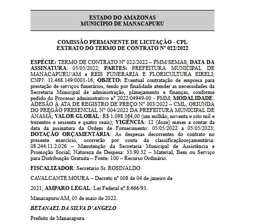 De acordo com o Diário Oficial dos Municípios do Amazonas, a empresa Reis Funerário e Floricultura Eireli vai prestar o serviço por um ano ao Poder Executivo Municipal.