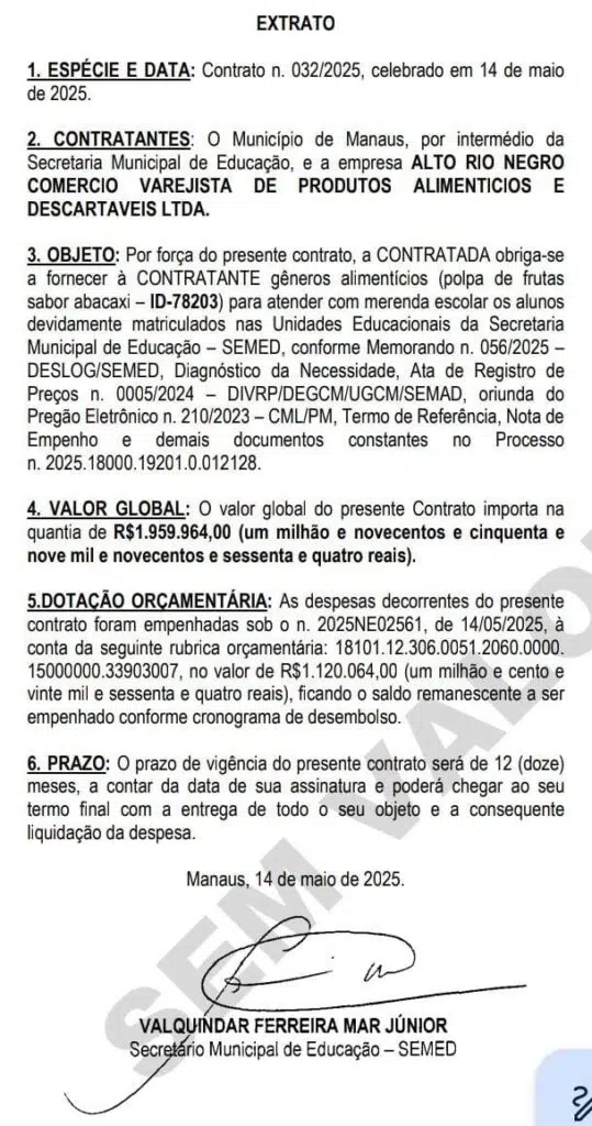 Segundo a Semed, o processo licitatório seguiu os trâmites legais. O secretário municipal de Educação, Valquindar Ferreira Mar Júnior, assinou o contrato. A pasta afirma que o objetivo é garantir alimentação saudável e variada nas escolas.