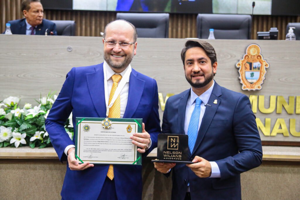 A Câmara Municipal de Manaus (CMM) concedeu, na tarde desta sexta-feira (16/06), a Medalha de Ouro Cidade de Manaus ao advogado e empreendedor Nelson Wilians. A entrega da honraria foi proposta pelo vereador Diego Afonso (União Brasil), que destacou a atuação do homenageado, considerado um dos maiores tributaristas do país, em defesa da Zona Franca de Manaus (ZFM).